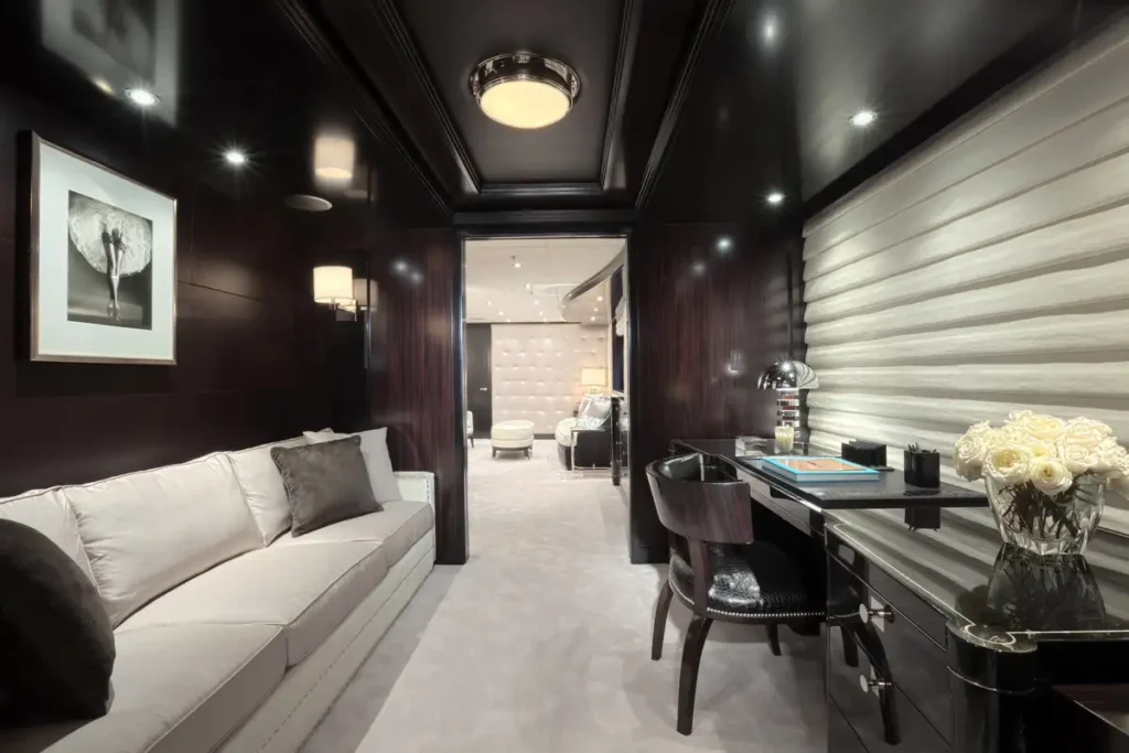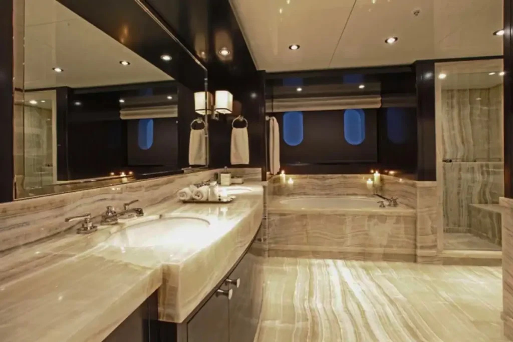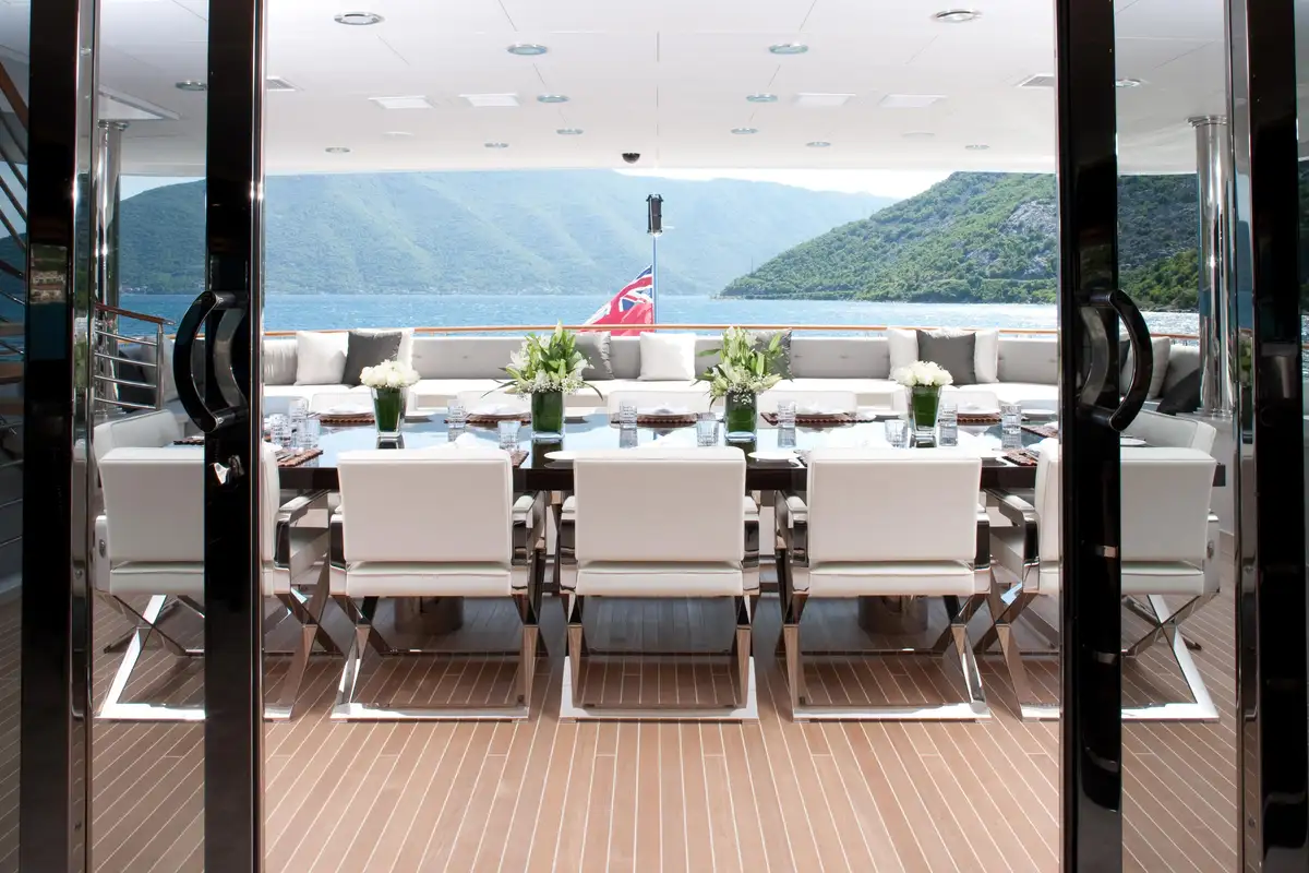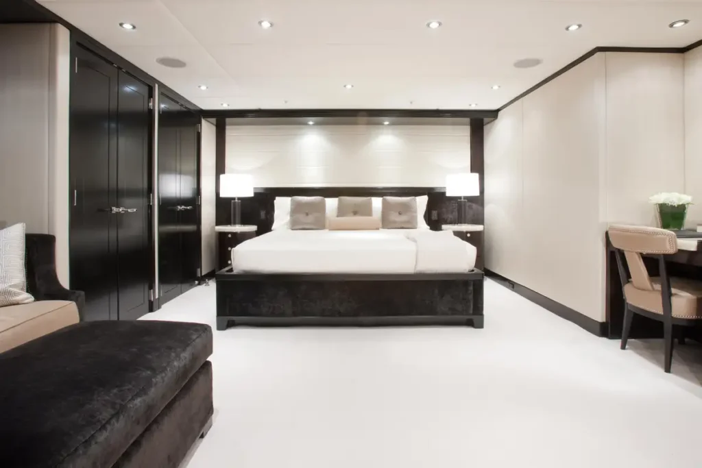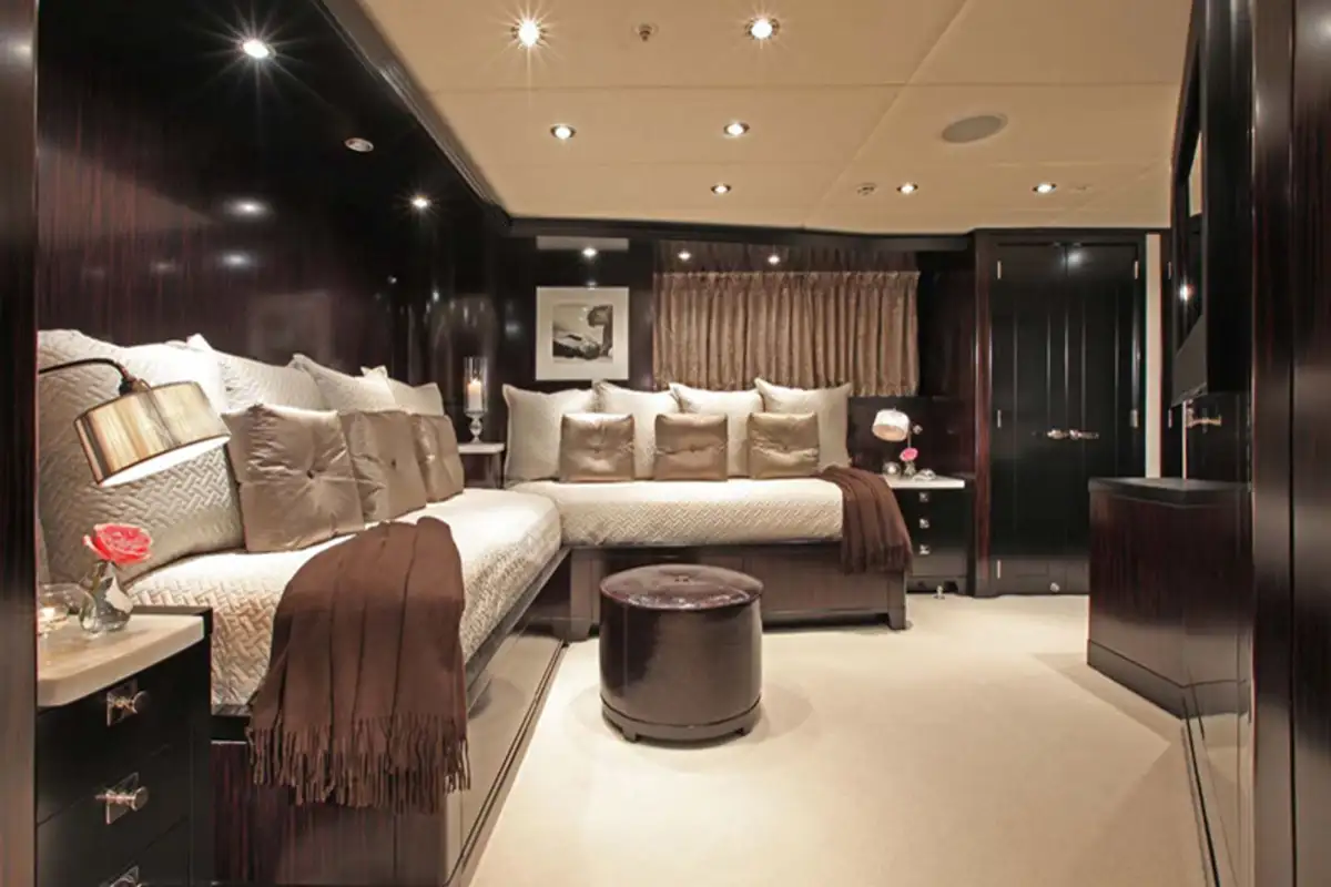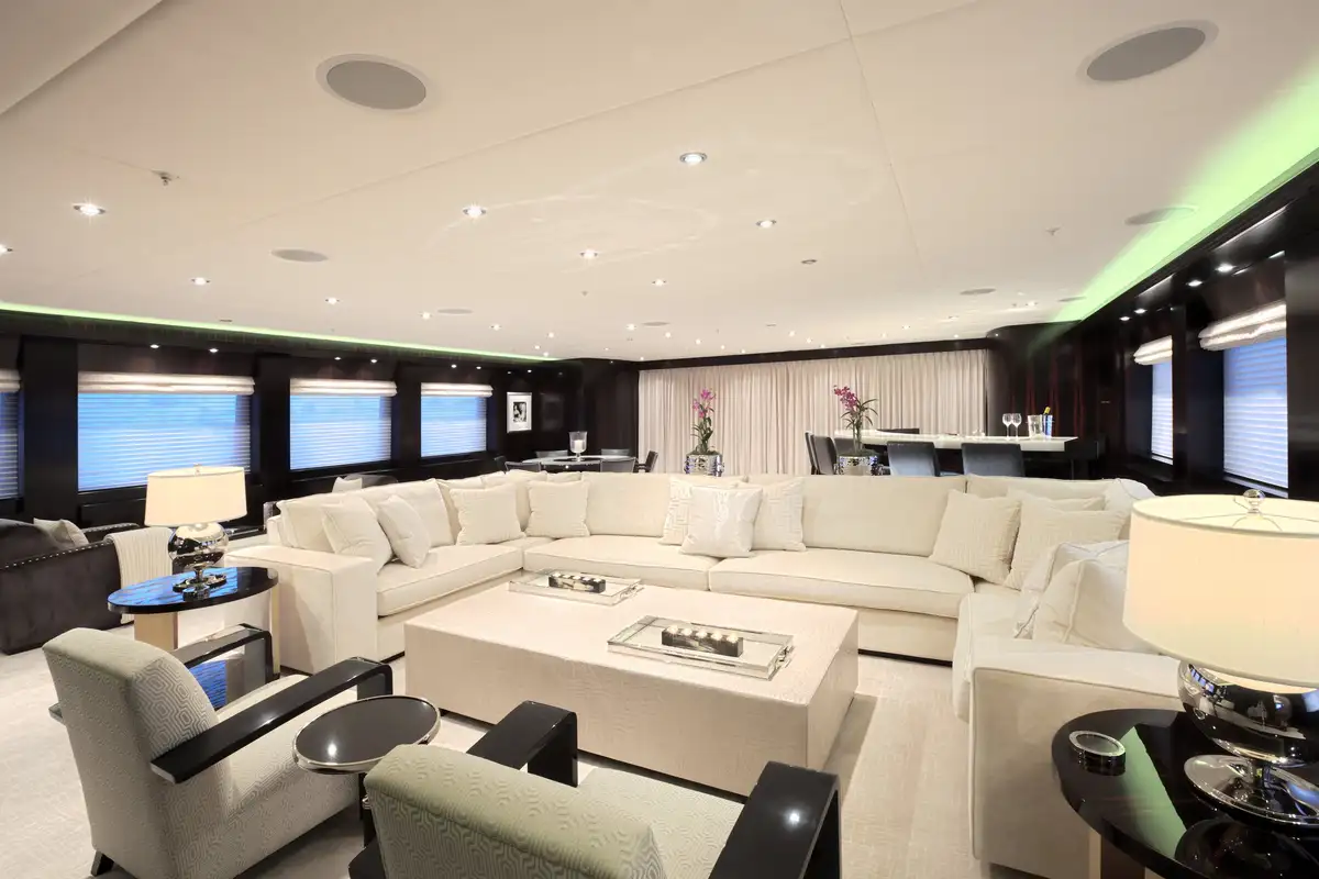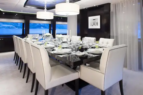 Accommodation is flexible for 12 guests in six beautifully appointed cabins. The full-beam owner’s cabin is on the main deck and offers a large walk-in closet and a private study. The full-beam VIP cabin comes equipped with a bathroom with double shower and separate jacuzzi tub. There’s the option for there to be three full-beam guest cabins, in addition to one twin cabin with two single beds and one fold-out bed. All guest cabins have en suite facilities.