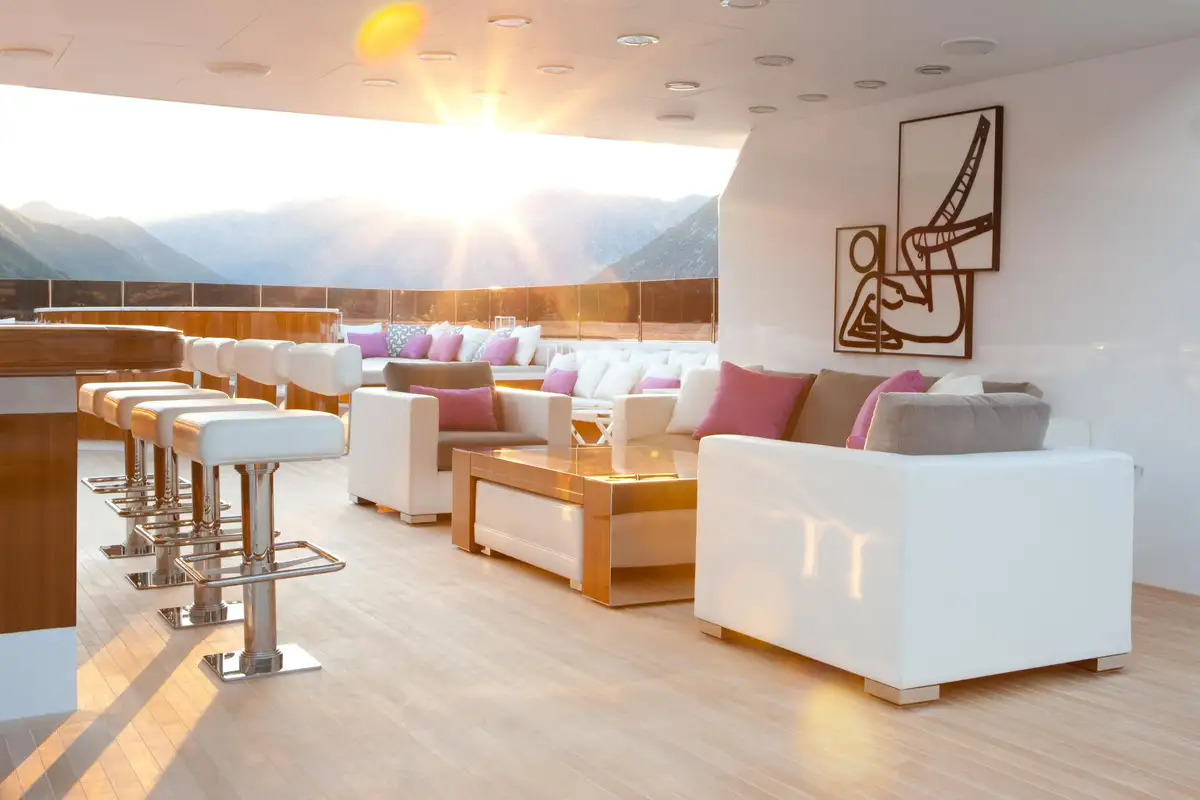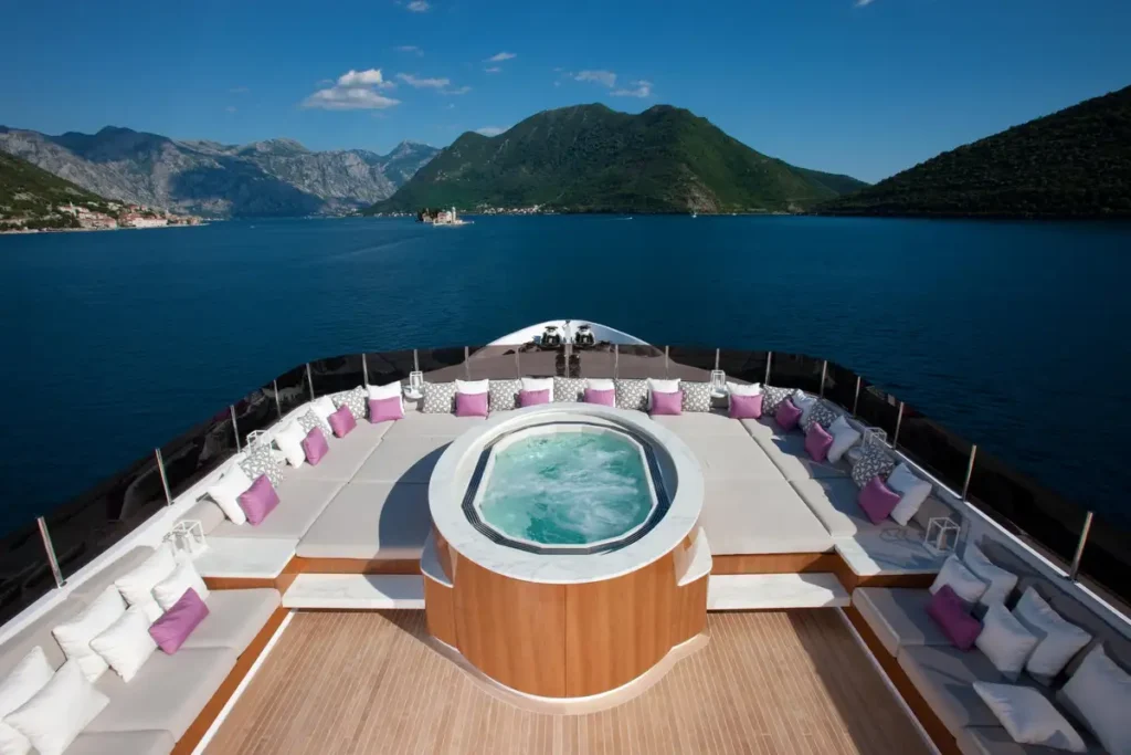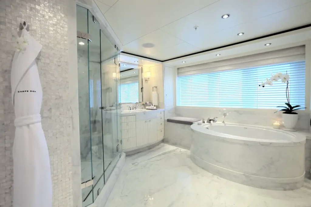 58.2m (191ft) in length, CARPE DIEM’s interior and exterior spaces are wonderfully flexible, and there’s a large selection of seating and lounging options. The inviting sun deck has an oversize jacuzzi, sun pad lounging, and a bar, ideal for spending sunny days relaxing with a cocktail. The extended swim platform provides easy access to the water, making an afternoon of watersports a tempting proposition.
