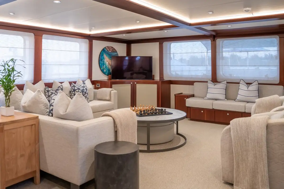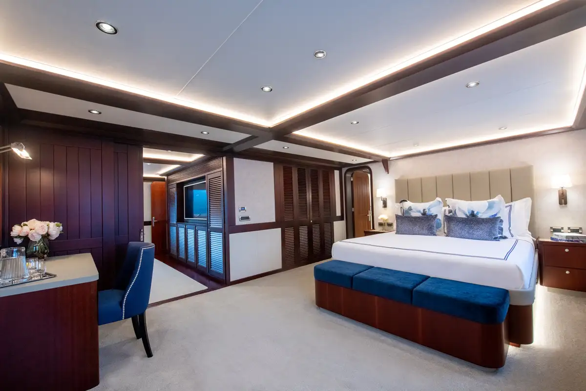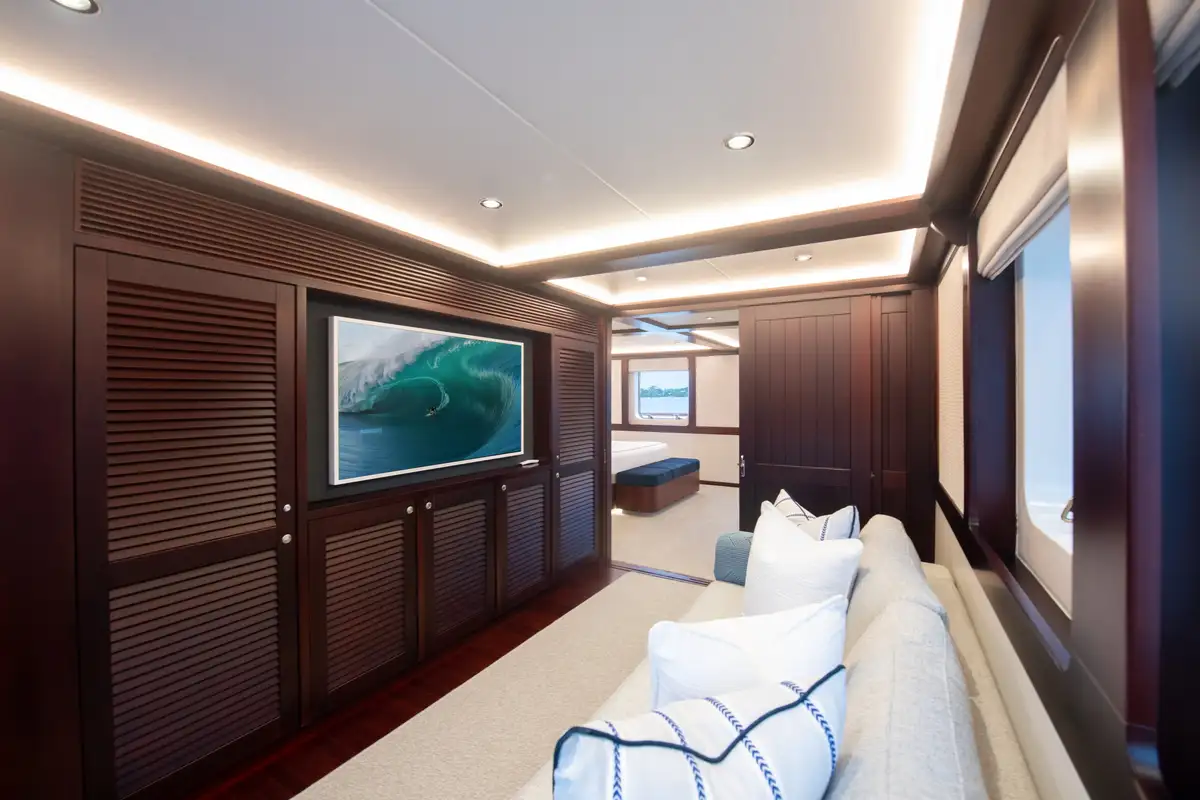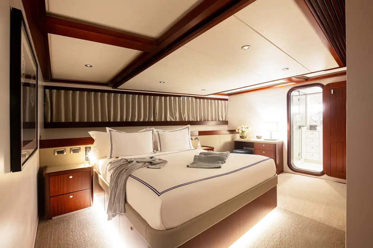 When it’s time for bed the master suite is up on the bridge deck with a private sitting room and a terrace overlooking the jacuzzi on the forecastle deck. The main deck is home to three double cabins and two convertible cabins, restfully decorated, completing adaptable accommodation for 12 guests.