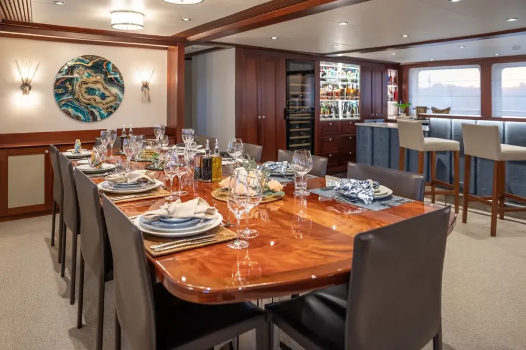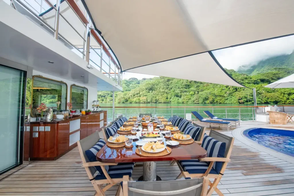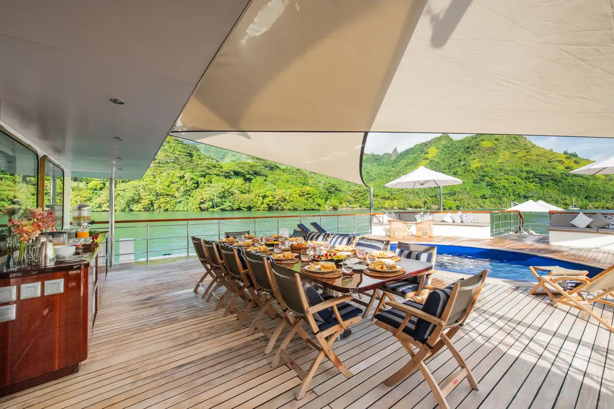 Then everyone gets together for breakfast in the Great Room on the forecastle deck where there will be exotic smoothies on offer at the sit up bar, indulgent pastries at the dining table or whatever you would prefer, courtesy of the talented chef, as you plan the day’s action with Captain Sam.