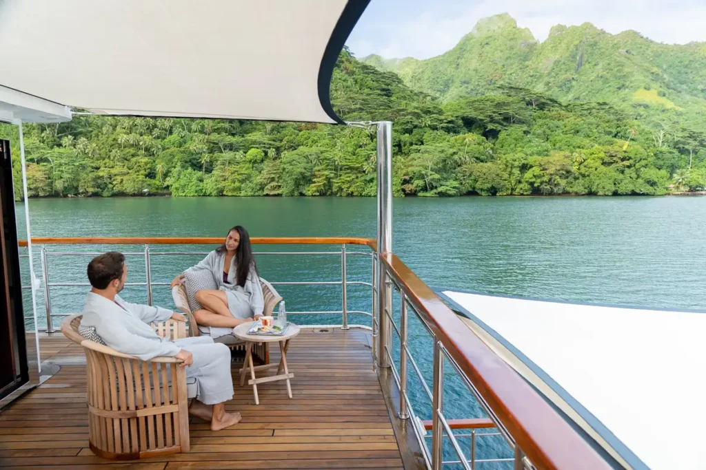 After the salt has been showered off, enjoy a sumptuous lunch of exquisitely prepared fresh local produce al fresco on the forecastle deck aft before spending a lazy afternoon with a book on the sun loungers around the huge, welcoming jacuzzi pool as Captain Sam takes you to your next location. If you want to turn it up a little, head for the sauna and steam clean the pores.