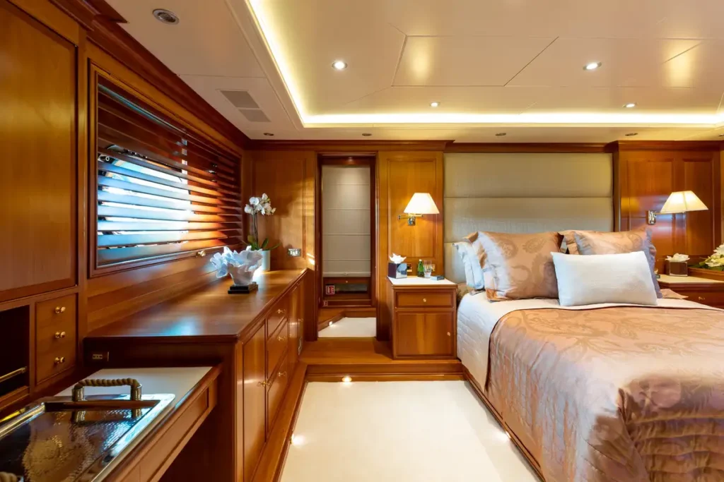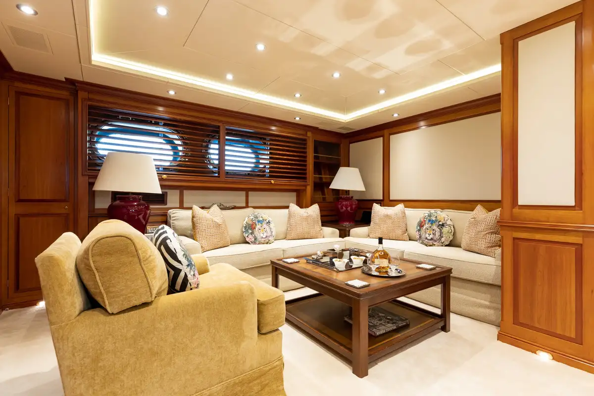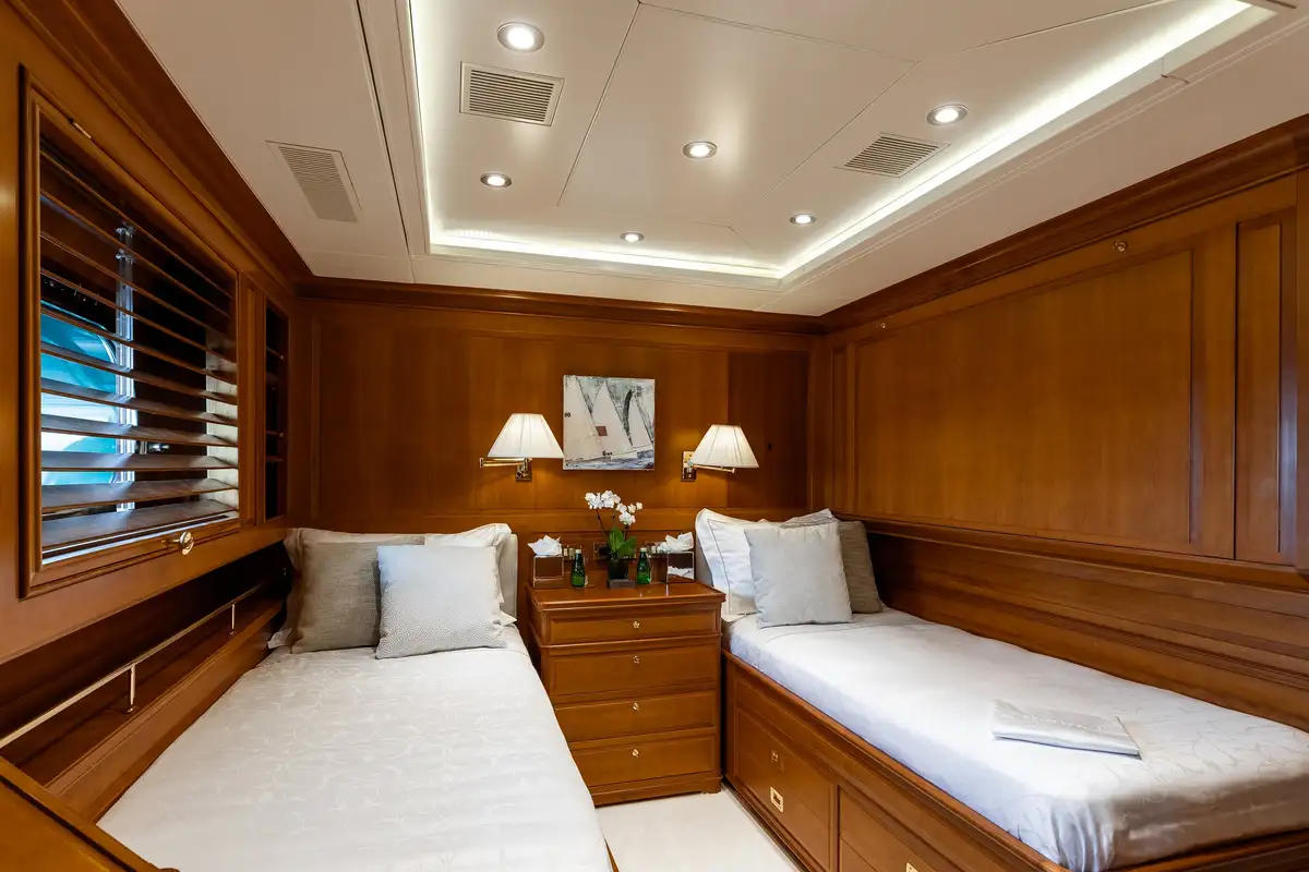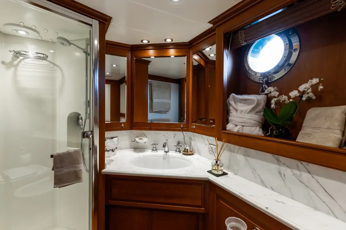 She welcomes six to seven guests in three cabins. The master cabin is full beam and has a walk in wardrobe, a separate study area and a bathroom with marble-topped bath. She also has two twin cabins with generous en suites, one with an additional pullman child’s berth, making her perfectly suited for families.