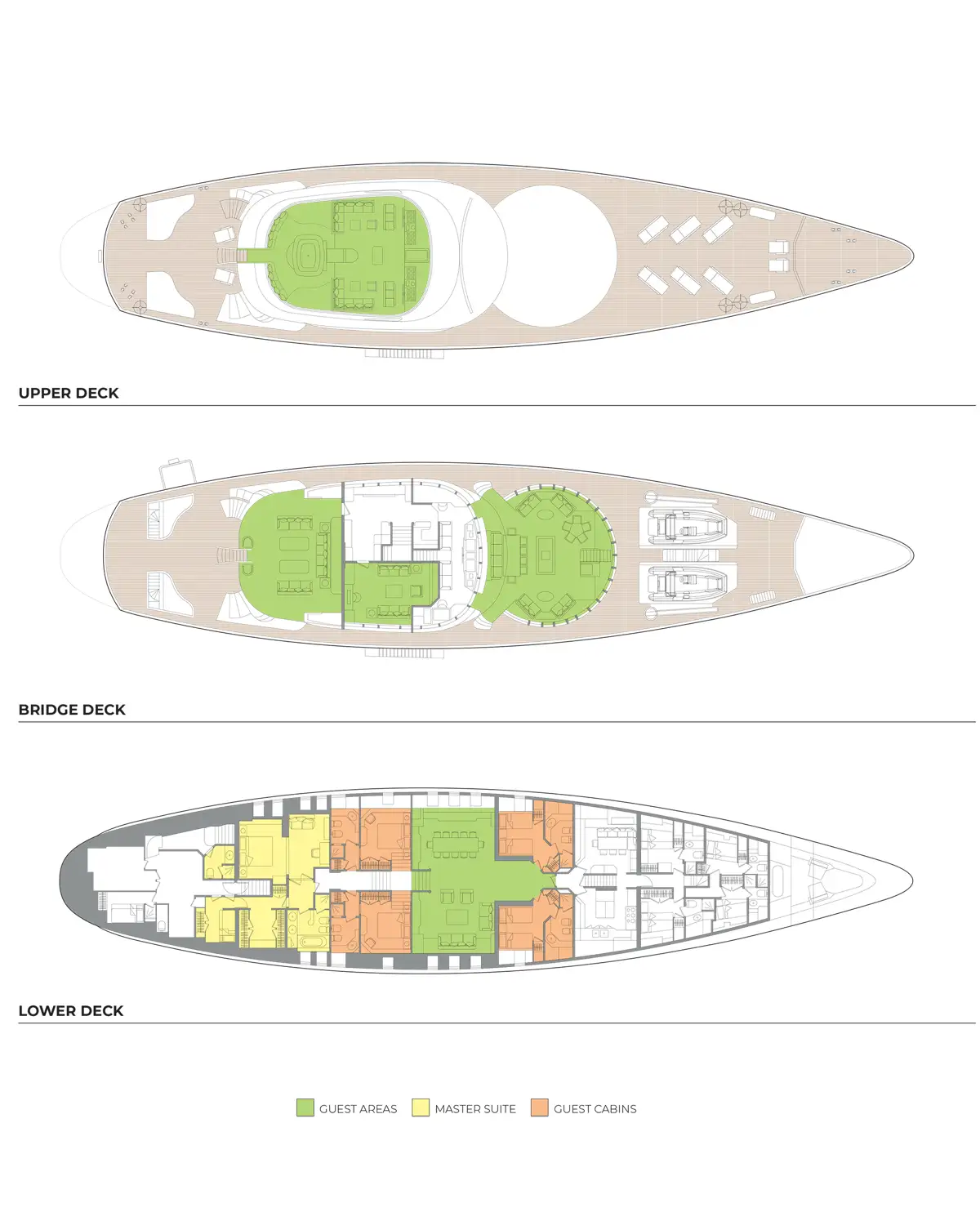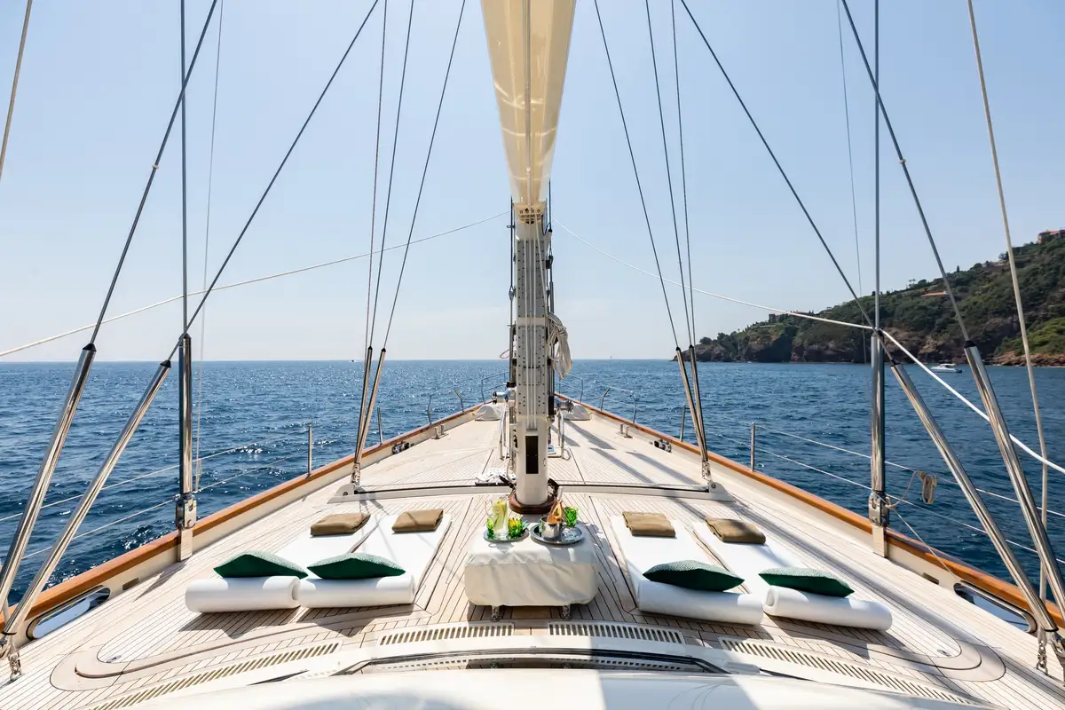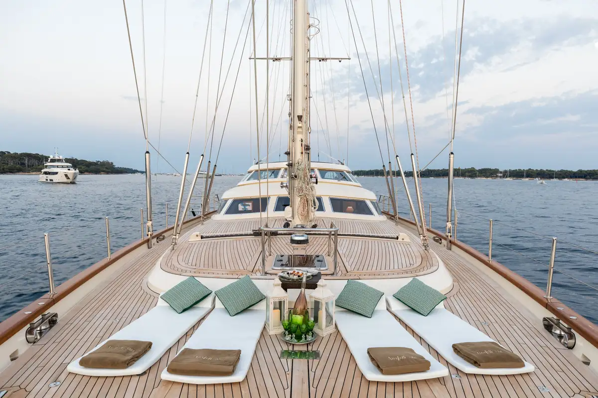 She welcomes six to seven guests in three cabins. The master cabin is full beam and has a walk in wardrobe, a separate study area and a bathroom with marble-topped bath. She also has two twin cabins with generous en suites, one with an additional pullman child’s berth, making her perfectly suited for families.