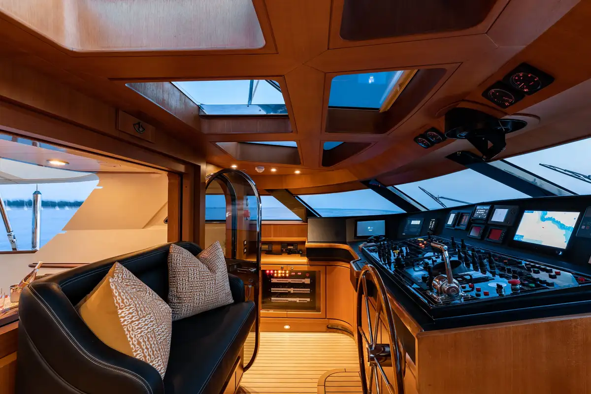 The cherry wood panelled pilothouse, with its lounge, desk and wraparound views, is separated from the cockpit by doors on the port and starboard side, giving guests privacy while underway or at anchor. From the pilothouse steps lead down aft to the guest cabins and forward into the main lounge with its cosy lounge to port, extendable walnut table to starboard, another dining option, and large portholes.